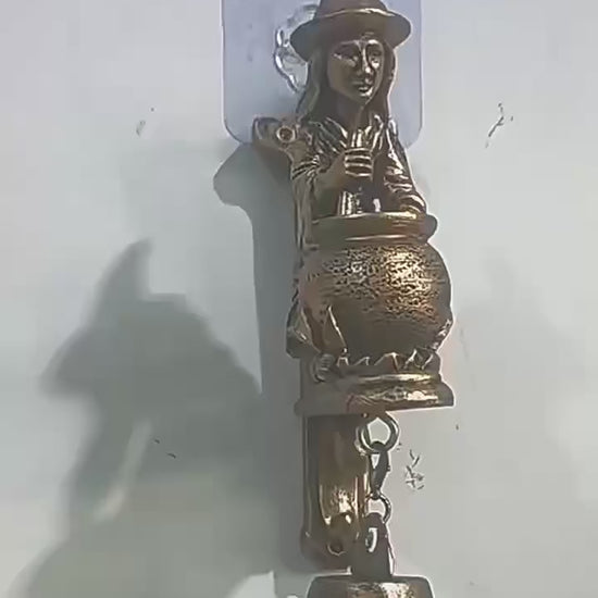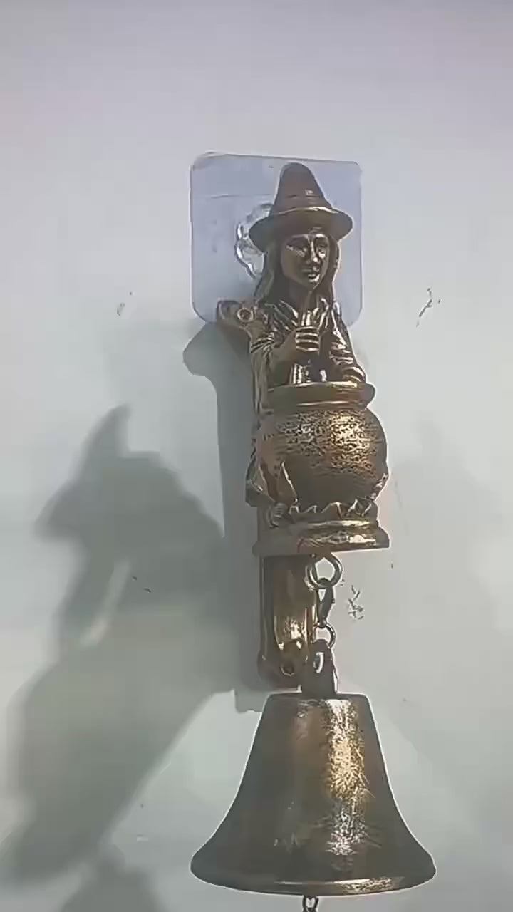 Fabriquée en métal robuste (fonte), elle représente une sorcière penchée sur son chaudron, accompagnée de son fidèle compagnon canin, avec une cloche gravée "WITCH BELL" qui se balance en dessous. Son aspect vieilli lui confère un style vintage et authentique, idéal pour les amateurs de décors rustiques et féeriques.